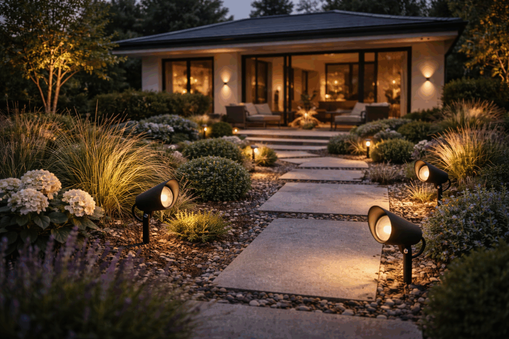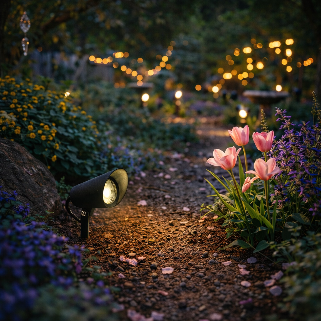 Stellen Sie sich einen warm beleuchteten Garten am Abend vor – dezente Lichtpunkte zwischen Pflanzen, sanfte Akzente entlang des Weges, ein harmonisches Gesamtbild.